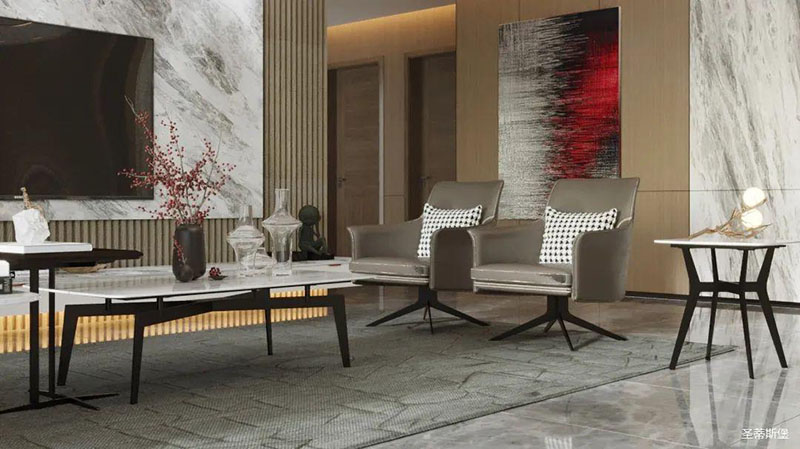 純美的線條,沉穩的色澤,為空間定下了低調而華麗的基調。渾然天成的實木與巖板紋理,讓角幾蕩漾出一幅“水光瀲滟”的潑墨油畫。三兩紅枝點綴,表達著“枝頭并蒂祝吉祥”的美好祝愿。光影透過極簡金屬幾腳,折射出一種隱藏的優雅氣質。大小、高低不一的天然材質角幾組合在一起,時尚又個性,不僅便于移動,還表現的靈活且輕巧。