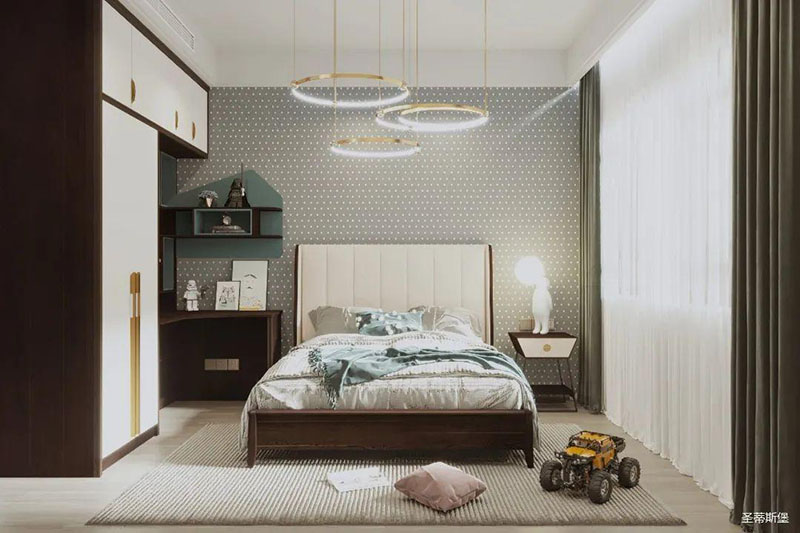 桌柜一體接壤設計,絢麗與沉穩相互襯托,足以達到空間最好的狀態。飽和又柔潤的色塊,整齊坐落于床體柜身,通過極簡規劃分配,刻畫出完美的實木紋理。造型獨特的床前燈,像一抹陽光照進心扉,散發著童真與夢幻的味道,形成了獨有的輕奢精致感。