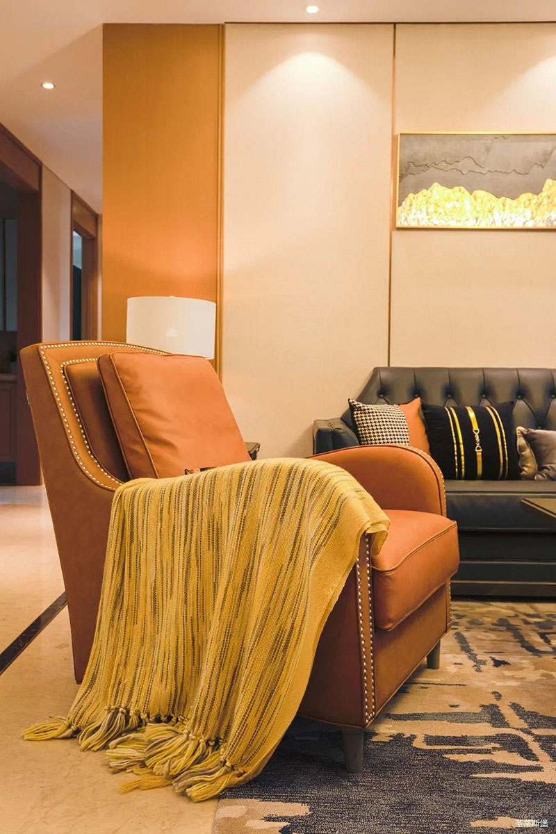 愛馬仕橙的休閑椅是空間的點睛之筆,相對于霸氣沉穩(wěn)的墨綠雙人沙發(fā),它更為時尚摩登,兩者合理搭配,賦予了空間陽剛與柔情并存的意境。