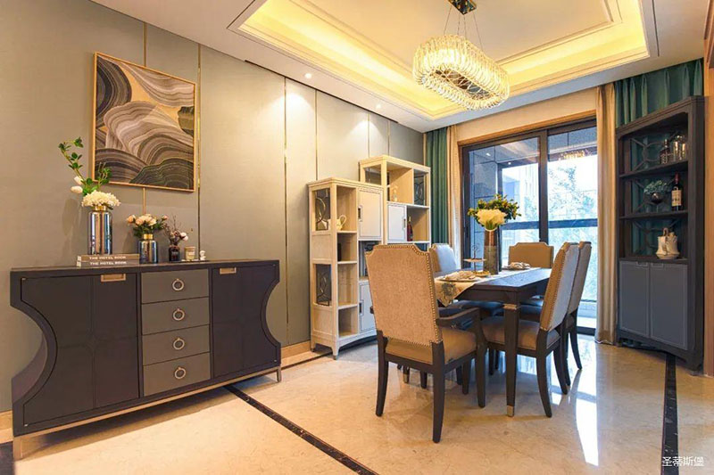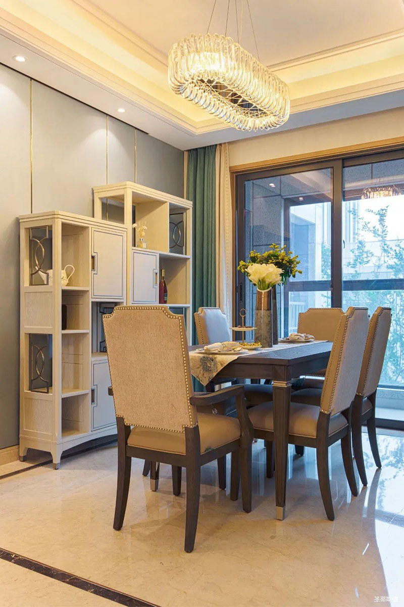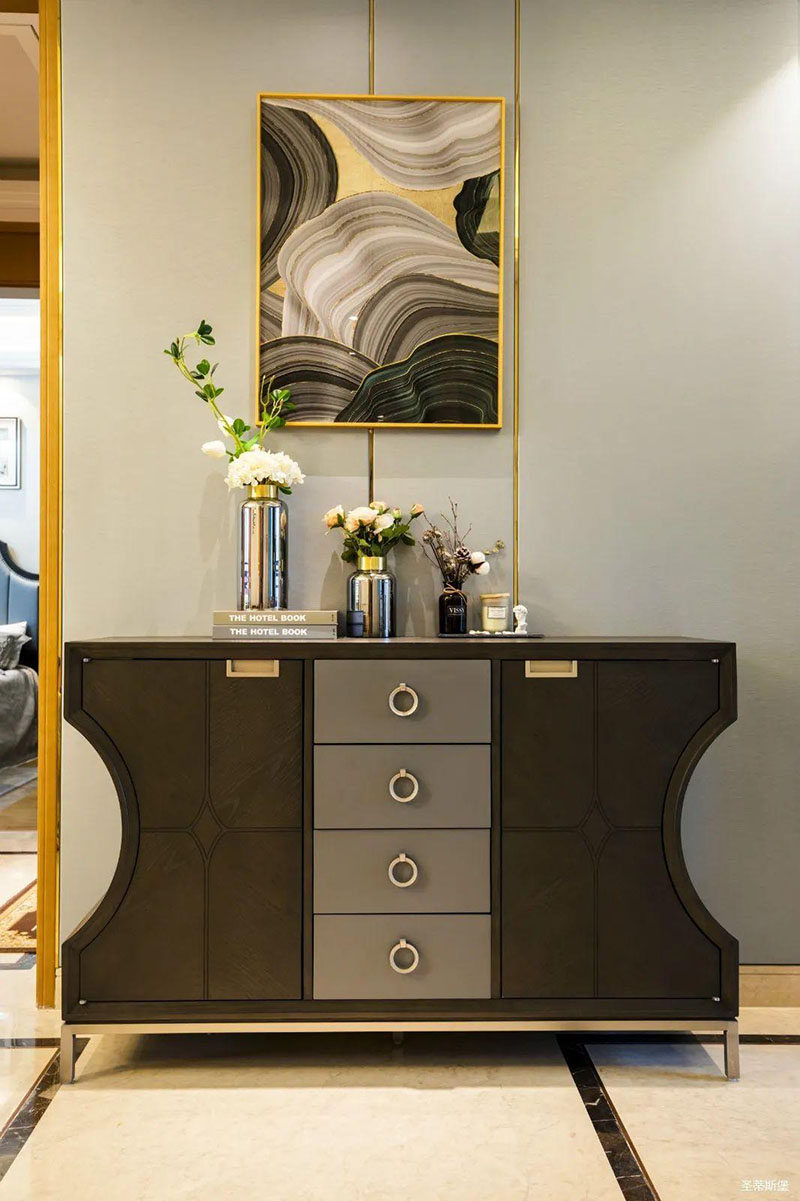 米白色餐邊柜坐落餐廳一角,簡約沿框線條,層次分明。金屬半圓與實木鑲嵌,盡顯優(yōu)雅輕奢的姿態(tài)。