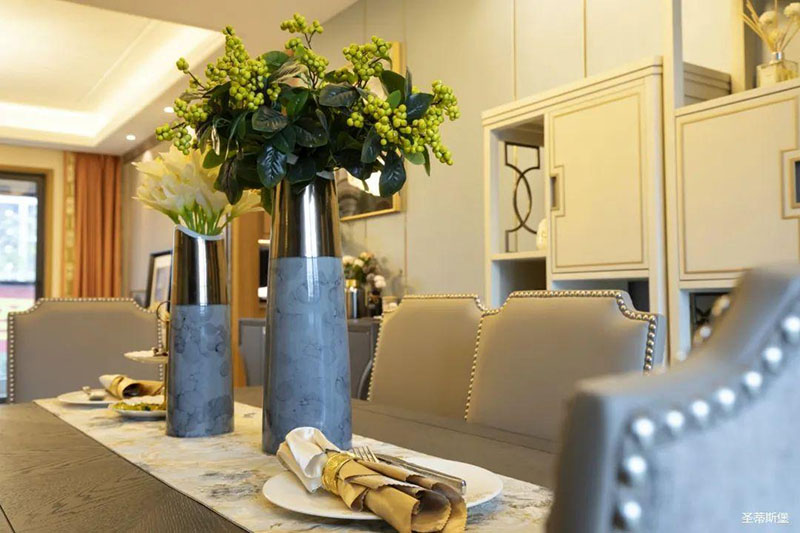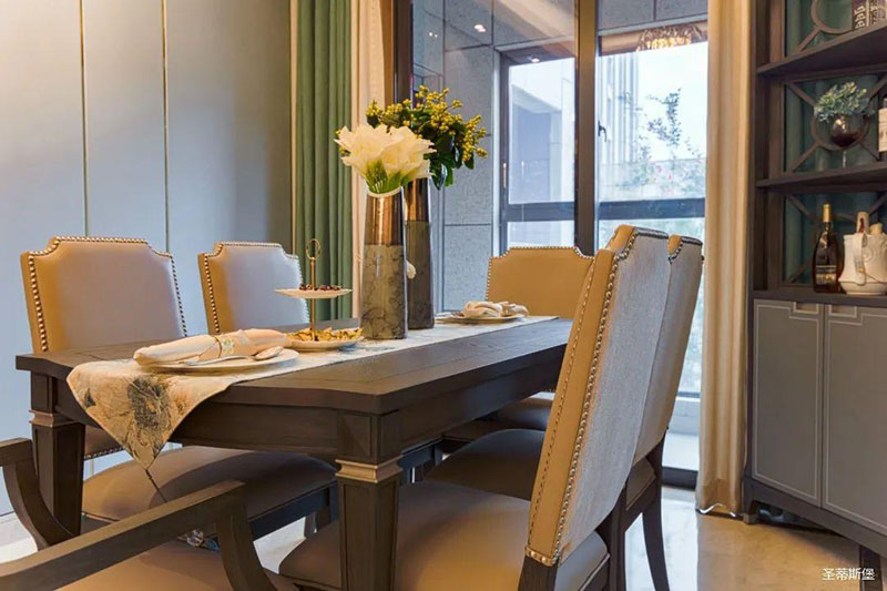 看似傳統(tǒng)實木的餐桌,細節(jié)之處卻盡顯輕奢精致格調(diào),高級灰軟包,原金屬鉚釘嵌入,在體現(xiàn)時尚感的同時,也提升了用餐的舒適度。