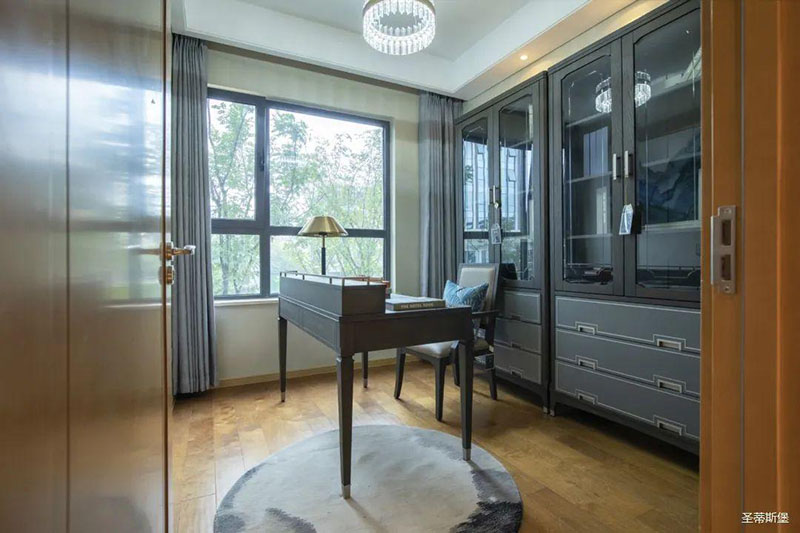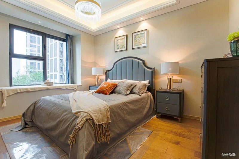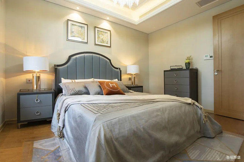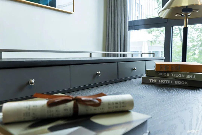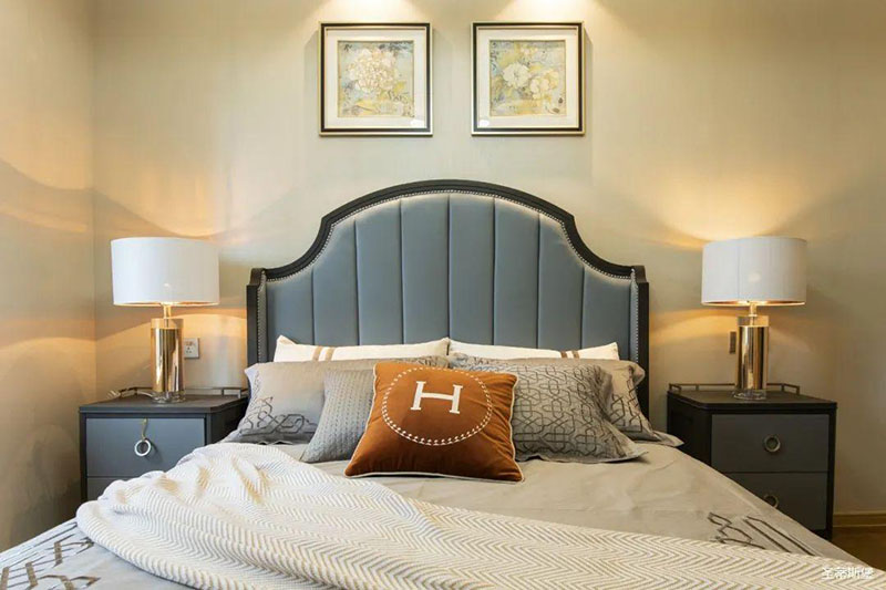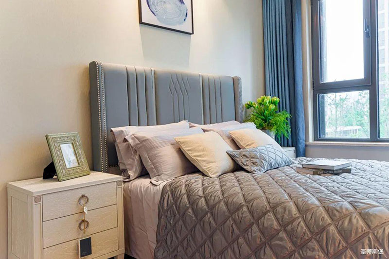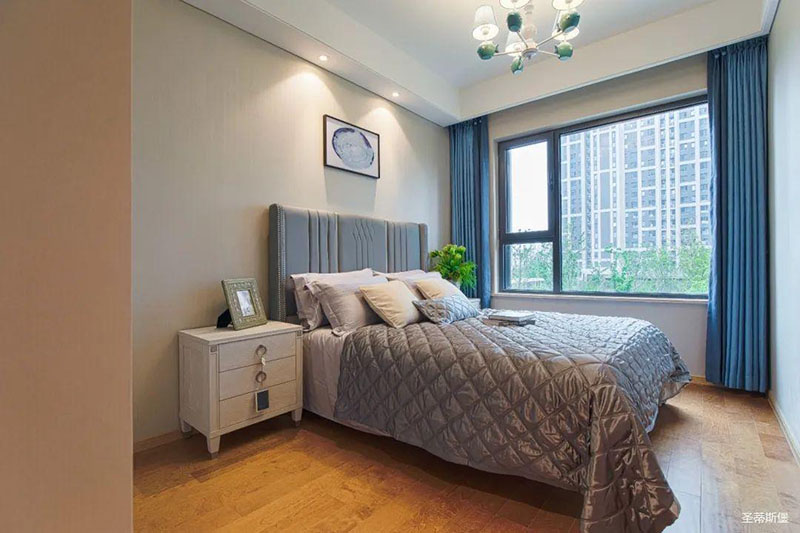 次臥高床屏由金屬鑲嵌,呈現(xiàn)簡約有序的線條,霧霾藍床屏與淺藍朦朧裝飾畫,窗簾相呼應,色澤搭配和諧自然,無不透漏著一種簡潔大方視覺體驗。