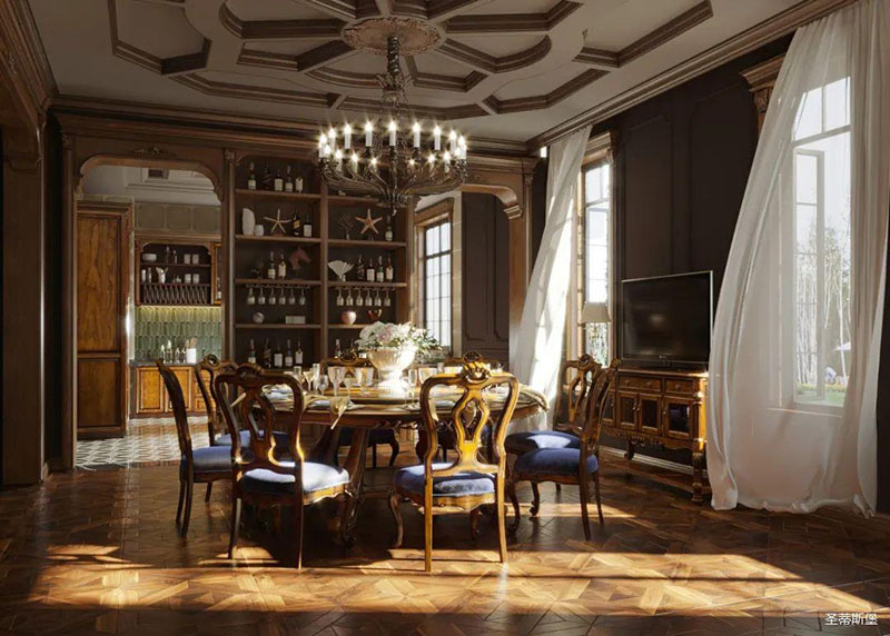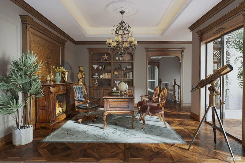書房護墻板是由白楓木皮拼接的花鬘圖案,顏色層次分明,立體感超強,營造了滿滿的美式鑲嵌藝術(shù)感。深沉木色邊柜在護墻板上延伸,逐漸浸染了古銅色的家具和燈飾,結(jié)合著拱形羅馬柱,塑造出端雅大方的環(huán)境氛圍。