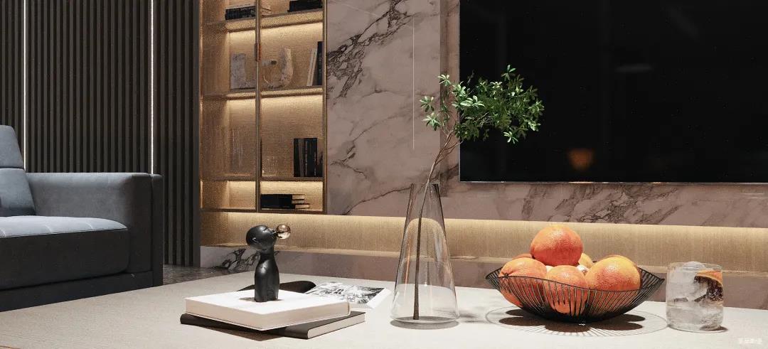 為了減輕現(xiàn)代都市工作的忙碌,客廳設(shè)計(jì)更偏向于對生活“解壓”的極簡,精選自然紋理的大理石與實(shí)木定制柜做一體化設(shè)計(jì),并在電視背景墻下半部分做挑空設(shè)計(jì),安裝個(gè)性十足的線性燈帶,延伸客廳視覺深度。