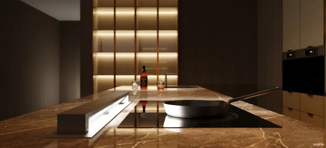 餐廚的極簡也可兼具多元,以一字內(nèi)嵌式展開的廚區(qū)收納柜,兼顧了從杯具、調(diào)料等廚用材料收納到廚電歸置動(dòng)線功能處理。在展示區(qū)域,玻璃隔板組合實(shí)木定制柜的表現(xiàn)形式,更是提升了空間的明亮度與寬闊感。