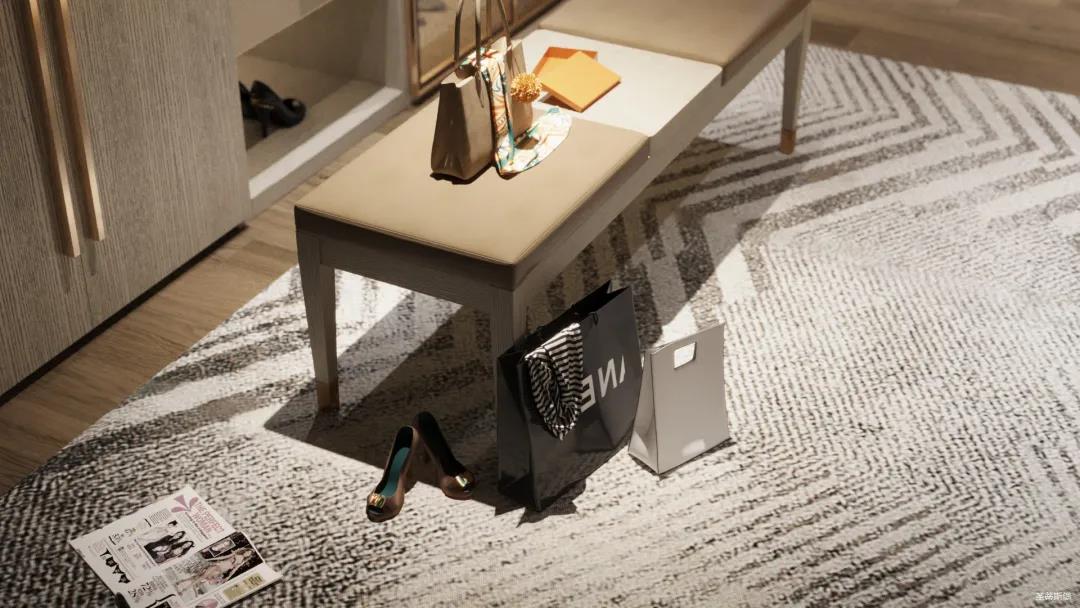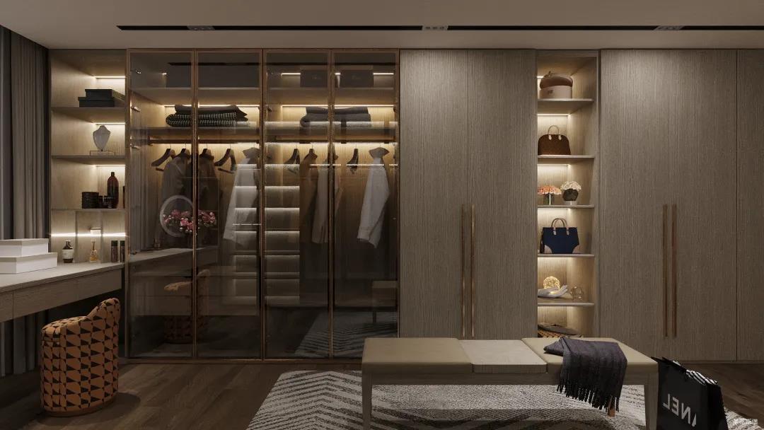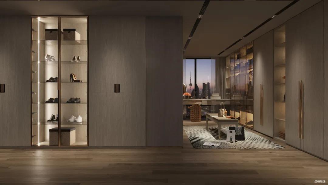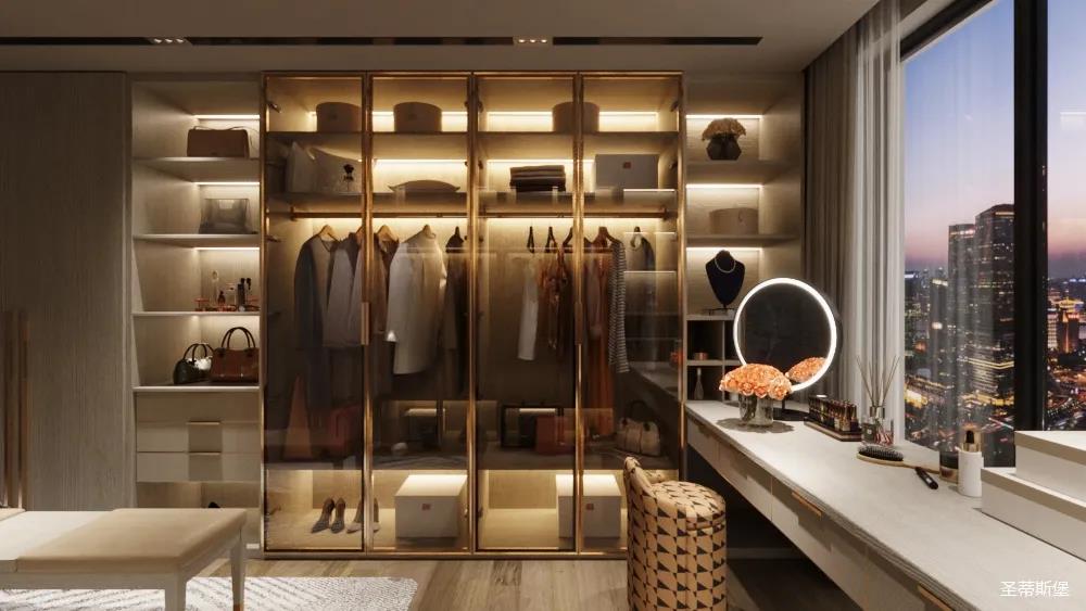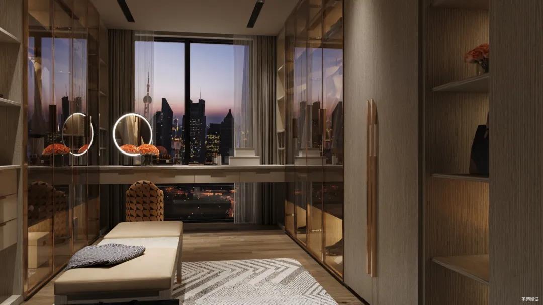 移步衣帽間,精簡華麗幾乎貫穿了整個(gè)空間,質(zhì)感高級的實(shí)木定制柜框架、通透明亮的玻璃展示區(qū)、色調(diào)醇厚的金屬鑲邊,每一項(xiàng)細(xì)節(jié)搭配都在強(qiáng)調(diào)著業(yè)主的高端品位。妝臺(tái)前的落地窗讓我們在觀賞都市繁華的同時(shí)也屏蔽了都市喧囂,讓我們置身于繁華都市中有一處寧靜休憩地。