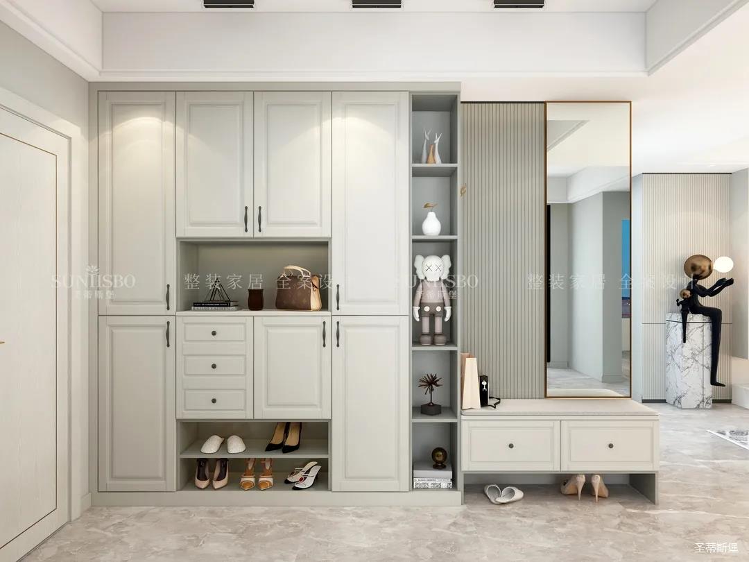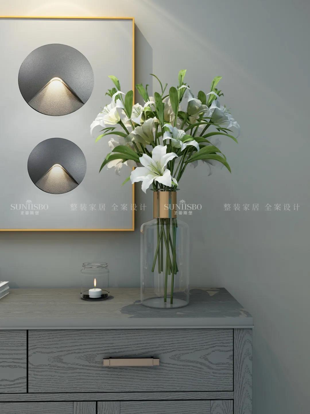 入戶側面設計一字型玄關,腰部,底部留空做層板,便于隨手放置鑰匙、鞋包等物品,中間留空設計為開放展示區(qū),加上軟裝飾品點綴,達到業(yè)主對品質(zhì)生活追求的理想狀態(tài)。應女主人要求,玄關還加長延伸出妝鏡和換鞋凳,讓動線自然流暢。