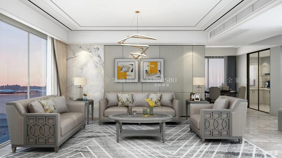 客廳在太陽的余暉下襯得柔和樸素,通透自然。超大江景落地窗,引入充足的自然光線灑向屋內(nèi),整體空間去除繁復的設計,以柔和的線條作為鋪設,沙發(fā)側面與地毯中的幾何造型組建了一個極富藝術感的空間,采用天然實木材質(zhì)制作的家具和織物,色彩淡雅且不張揚。隨處可見的藝術造型裝飾,無一不展示著美式格調(diào)中輕奢的韻味。