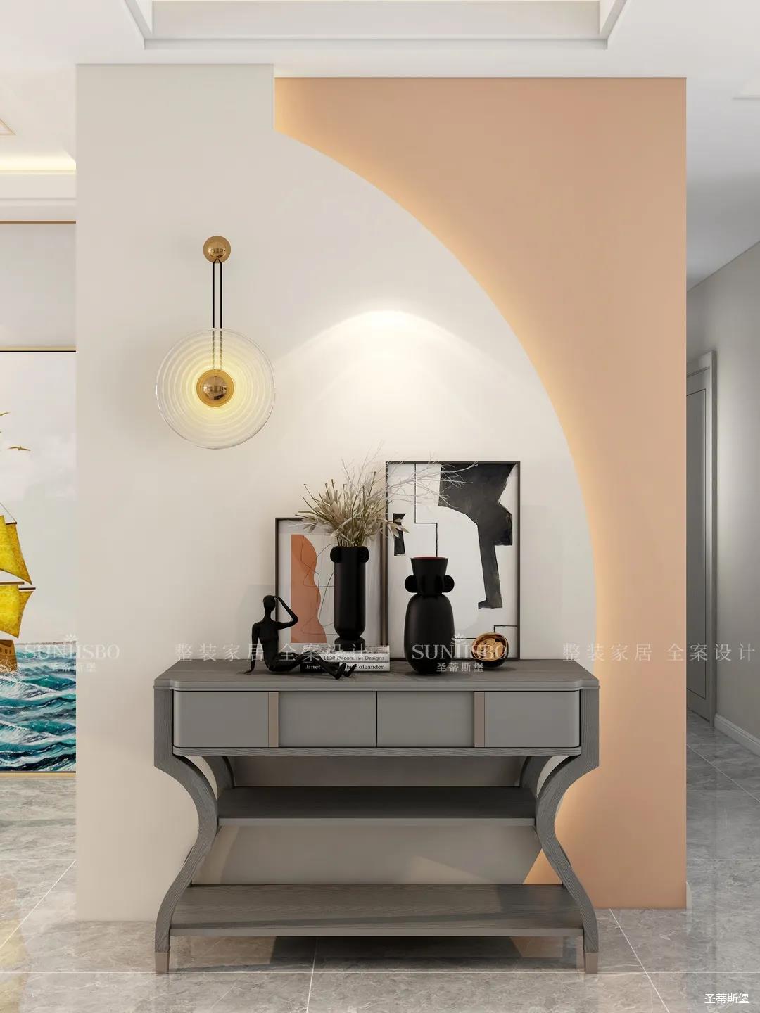 入戶玄關(guān)立體抽象裝飾物的擺設(shè),和幾何藝術(shù)畫相互搭配,藝術(shù)感滿分。黑白色的經(jīng)典搭配凸顯質(zhì)感,淺橙與白色墻面間安裝燈帶,既溫暖了入戶氛圍,也增加了空間的層次感。