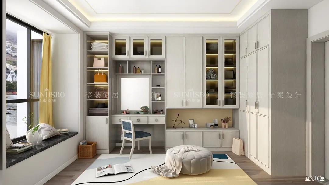 衣帽間是女主特別要求的,設(shè)計是將房間打造成衣帽間系統(tǒng),采用L型布局,壁掛式設(shè)計,讓穿搭動線更順暢,視覺上也更通透,可直觀的展示女主人穿搭品味。玻璃層板與背板花色的結(jié)合,精致靈動,成為時尚與輕奢的寫照,封閉區(qū)衣柜的合理格局規(guī)劃,完美詮釋現(xiàn)代輕奢風(fēng)于當(dāng)代定制中的前瞻性。