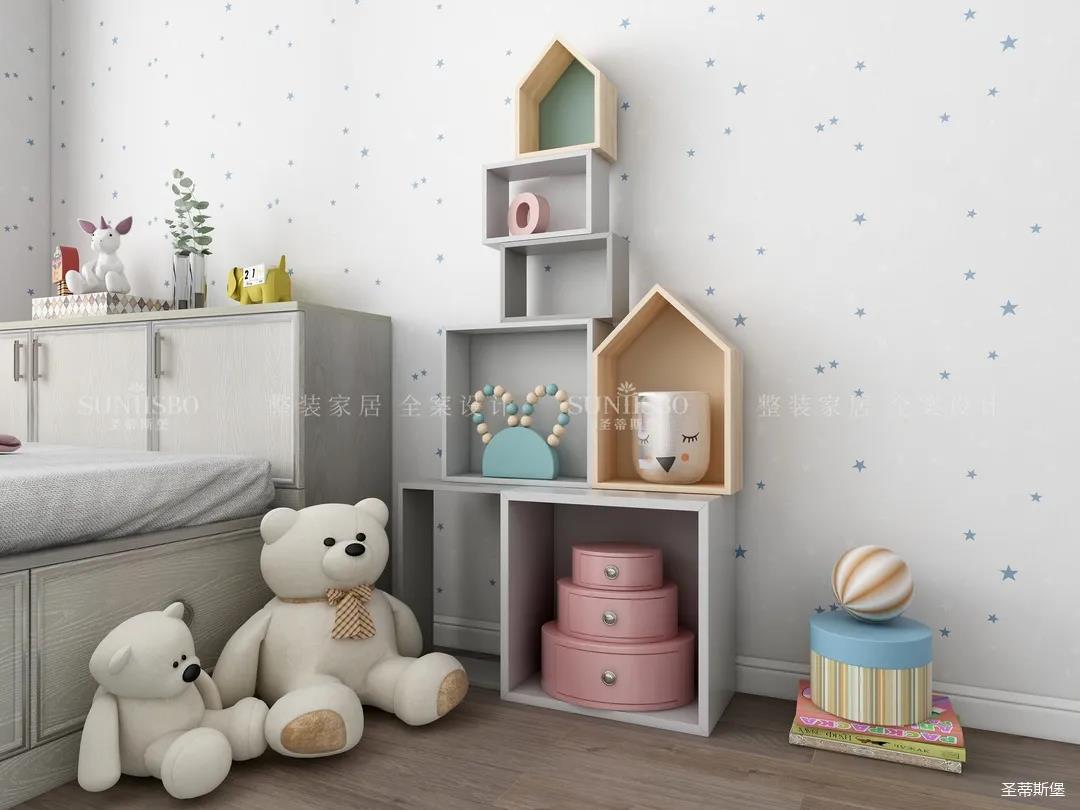 兒童房摒棄了傳統(tǒng)榻榻米的呆板與嚴肅,延續(xù)主臥輕奢雅致的空間氛圍,以木質(zhì)為主材質(zhì),利用面板的線條帶來視覺上的延伸,將童趣與理性相融表現(xiàn)兒童應(yīng)有的學(xué)習(xí)氛圍與生活習(xí)慣。開放式展示區(qū)應(yīng)用藍色點綴,再次強化了空間專屬兒童的活躍格調(diào),也呈現(xiàn)了設(shè)計師在材質(zhì)與色彩運用上的精細與專業(yè)。