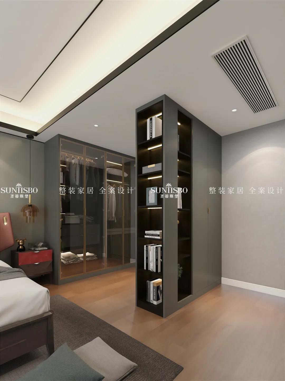主臥的床是意式輕奢時尚與東方雅韻極致融合,沒有半點突兀和乖張。,意大利最出名的便是它的工藝與設計,時尚的莫蘭迪色系、輕奢金屬的運用,體現嫻熟的意式家具設計底蘊,兩者之間融合的相得益彰。
