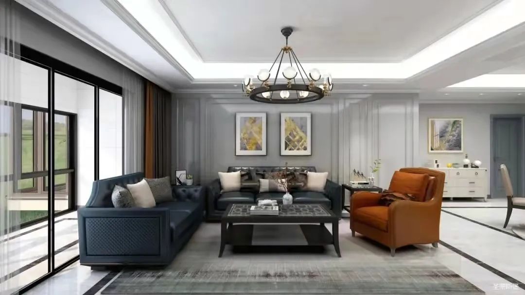 沙發皮色采用深淺不一的咖色拼接。讓空間顯得精致有質感。在沙發的扶手邊框、底座,融入了愛馬仕橙,讓空間多了些靈動的生活氣息。搭配簡約單椅,給人一種視覺上的高級感。